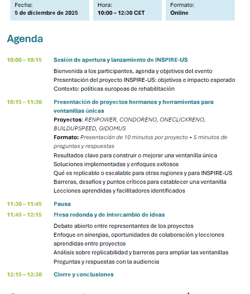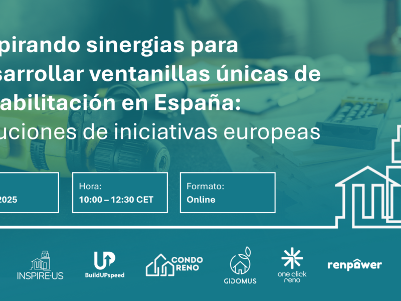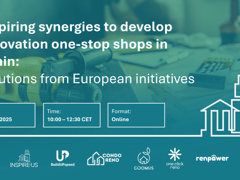 “Inspiring synergies to develop one-stop shops for renovation in Spain” is organised within the framework of the INSPIRE-US project in collaboration with RENPOWER, CondoReno, OneClickRENO, BuildUPspeed and GIDOMUS, all LIFE initiatives funded by the European Union.